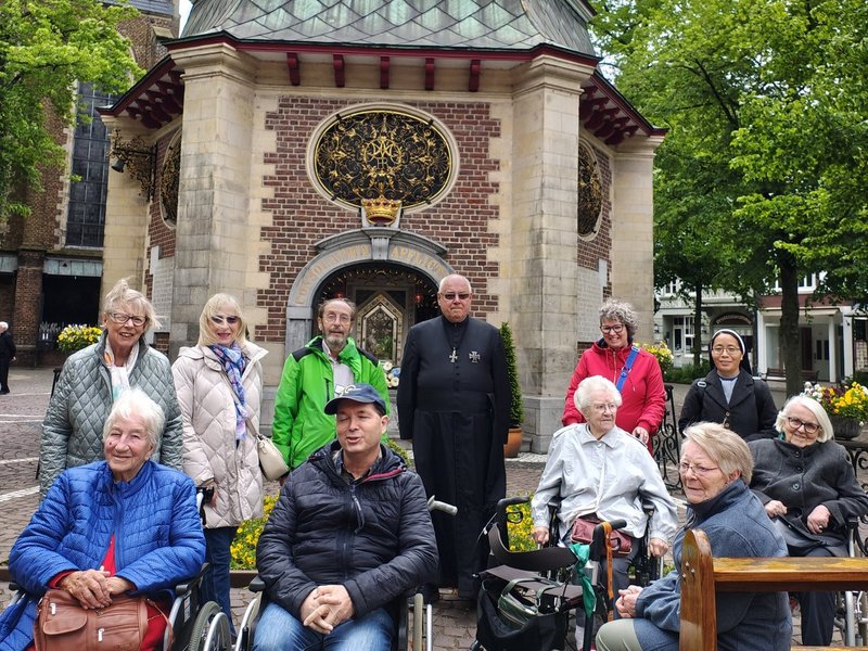 Zum Auftakt der Wallfahrtssaison Anfang Mai lud Frater Karl die Bewohnerinnen und Bewohner von St. Raphael zu einer Tagesfahrt nach Kevelaer ein. Gemeinsam mit den Mitarbeiterinnen Frau Weyer-Dorscheid und Sr. Josephine, den Ehrenamtlichen Frau Bosten, Frau Eschweiler und Herrn Meeßen sowie Pater Maneesh machten wir uns auf den Weg in den beliebten Wallfahrtsort.