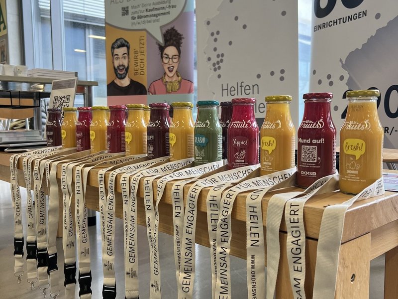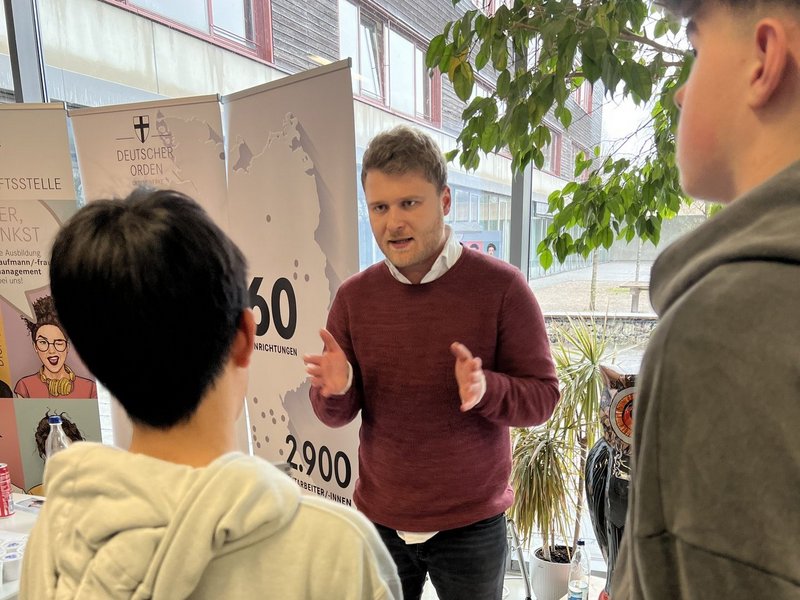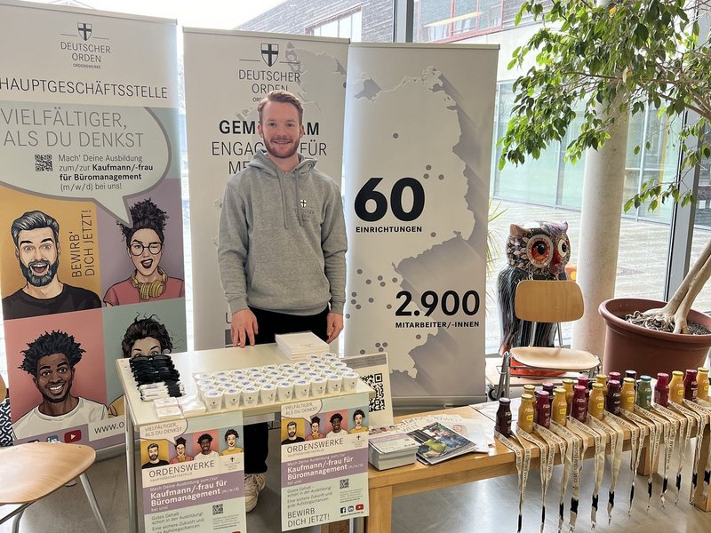 Auf der Berufsinformationsmesse in der Oberland Realschule Holzkirchen präsentierten die Ausbildungsbeauftragten Tessa Ottitsch und Marvin Kiegel mit dem Auszubildenden Thomas März die Zentrale der Ordenswerke.
