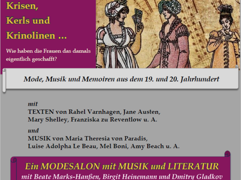 Begleitet wird sie von Birgit Heinemann (Violoncello) und Andreas Seipp (Klavier), die Musik von Komponistinnen des 19. und 20. Jahrhunderts spielen wie zum Beispiel Maria Theresia von Paradis, Luise Adolpha Le Beau, Mel Boni, Amy Beach oder Cécile Chaminade.