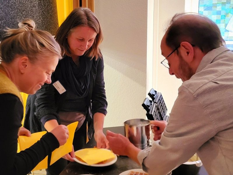Herr Orth erzählte die alttestamentarische Geschichte vom Erzengel Raphael und dem jungen Tobias. Nach dem gemeinsamen Singen von Adventsliedern erteilte Alltagsbegleiterin Kristin Engers den Anwesenden einen „Glitzersegen“ zum Advent, passend zum vorgelesenen Text „Es leuchtet noch immer“. Anschließend klang der Abend bei Glühwein, frisch gebackenen Waffeln und gemeinsamen Singen in der Caféteria aus, wo sich unsere Gäste an die Vorweihnachtszeit in ihrer Kindheit erinnerten und wohl ein bisschen wehmütig wurden.