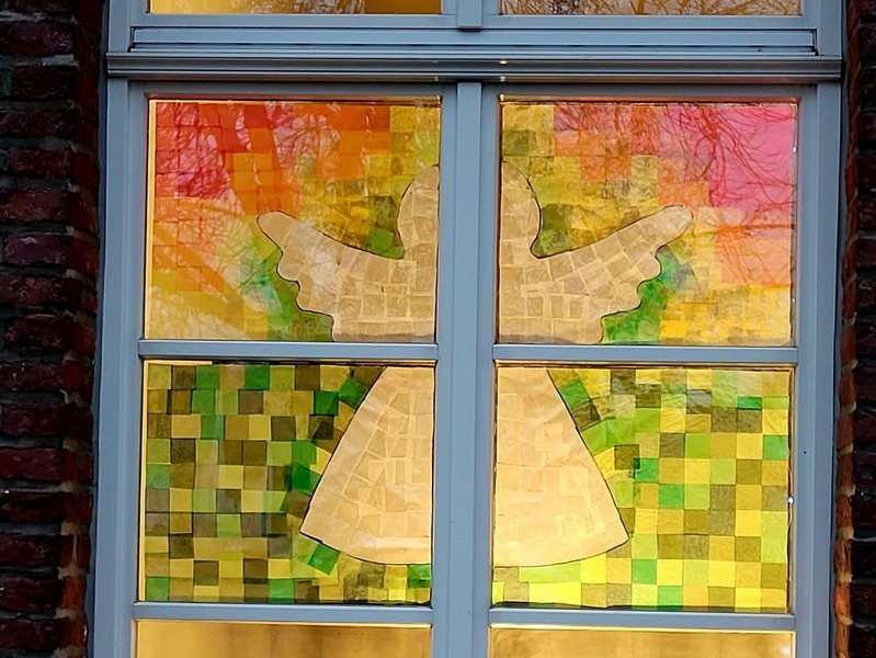 Mit diesem Eröffnungstext von Margit Umbach starteten die Bewohner/-innen und Gäste vor St. Raphael in den 1. Advent. Dort gibt es ein großes Sprossenfenster mit Engelmotiv zu bestaunen, kreiert auf der Basis einer Excelvorlage von unserem Bewohner Herr Orth. Sozialdienstmitarbeiterin Uli Weyer-Dorscheid hatte die Idee, in Anlehnung an den hl. Raphael, das Fenster mit einem Engelbild zu gestalten. Gesagt, getan. Und so schaffte es unsere geschickte Alltagsbegleiterin Andrea Müller in vielen Stunden gemeinsamer Bastelarbeit mit den Bewohner/-innen, einen wunderschönen Himmelsboten in „Pixel-Design“ anzufertigen, der herrlich leuchtet und ausgiebig bewundert wurde.