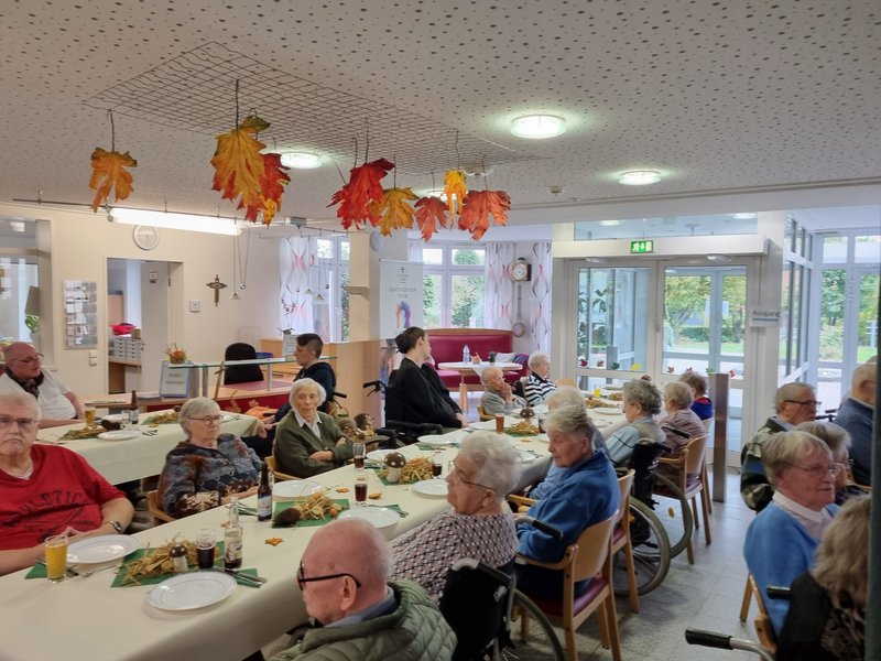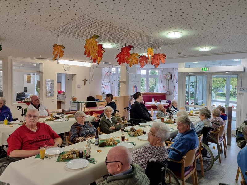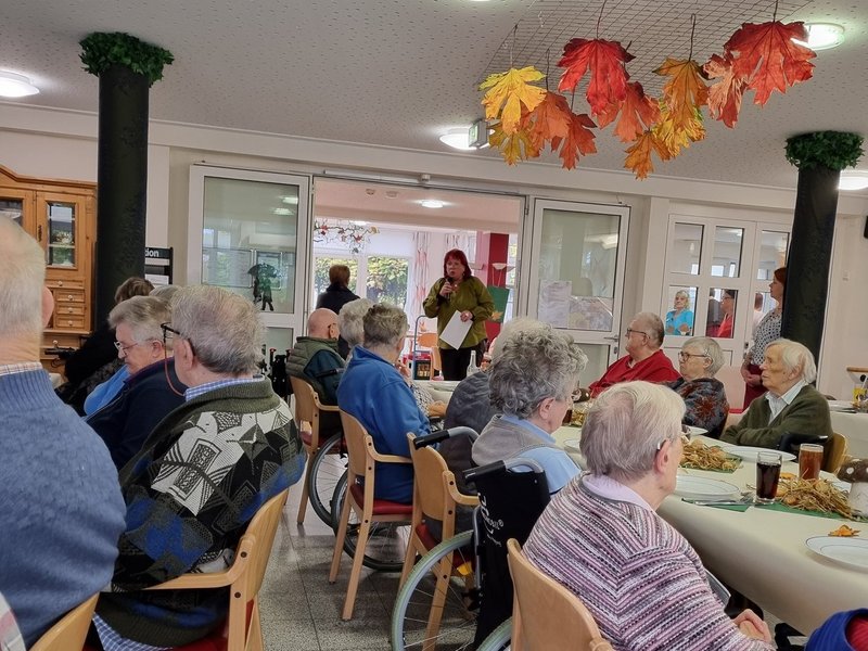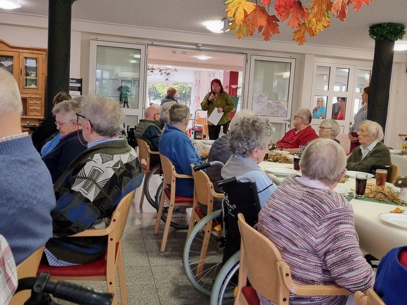 Am Montag, den 21.10.2024 haben wir unsere Apfel- und Kartoffelwoche unter dem Motto "Rund um den dollen Apfel und die olle Knolle" gestartet. Den Auftrakt machten Marianne Horstmann und Stefan Plake mit einem Küchenstammtisch. Dort wurde der Menüplan bis zum Ende des Jahres besprochen, sowie Wünsche und Anmerkungen bzgl. der Mahlzeiten entgegengenommen. Im Anschluss wurden alle Bewohnerinnen und Bewohner eingeladen, an der Eröffnungsfeier, die Natascha Tyrrell-Besta eröffnete, teilzunehmen. Bei guter Musik sowie leckeren Apfelpfannekuchen mit Apfelmus und kühlen Getränken hatten alle sichtlich Freude am Fest.