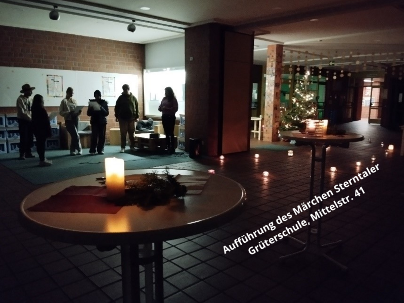 Die zweite Tür wurde mit Eltern, Lehrer/-innen und Schüler/-innen an der Grüterschule, einer Schule mit Förderbedarf, durch die Direktorin eröffnet. Kurzfristig wurde aus wettertechnischen Gründen der Lebendige Adventskalender in den Eingangsbereich der Schule verlegt und mit vielen Kerzen der Weg ausgeleuchtet. Schüler/-innen lasen einen Text über ein Licht vor, dass mutig dem Stern folgte, bis dieser stehen blieb und das Licht dabei immer heller leuchtete, weil Mut und Freundschaft im Leben ganz wichtig sind und die Welt heller machen. Dies wurde zudem noch durch die Aufführung vom Sterntaler Märchen unterstrichen. Mit Punsch und einem kleinen Basar mit selbstgebasteltem von den Schüler/-innen endete die Veranstaltung.