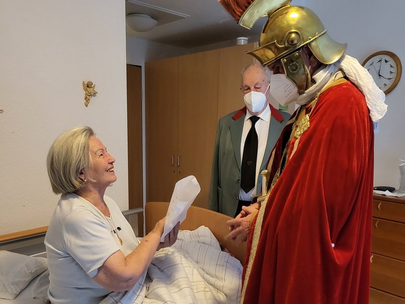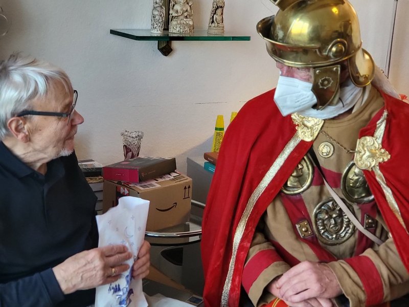 Im Vorfeld verteilte der St. Martin Weckmänner an alle Bewohner/-innen und Mitarbeiter/-innen, ehe er sich auf den Weg zum Feuer begab. Begleitet wurden die Menschen durch einen Trommelchor, der für reichlich Stimmung sorgte.