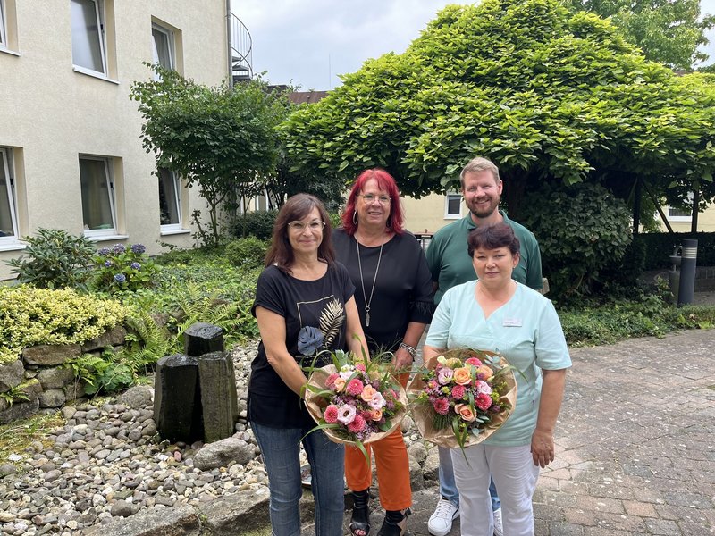 Im Rahmen einer berufsbegleitenden Weiterbildung haben Frau Prinz und Frau Rott die Ausbildung zur Pflegeassistentin bestanden. Die stellvertretende Einrichtungsleiterin Natascha Tyrrell-Besta und Pflegedienstleiter Christian Drerup gratulierten den beiden hierzu bei einem Sektempfang mit einem wunderschönen Blumenstrauß. Die ganze Belegschaft freut sich mit den beiden zur bestandenen Prüfung.
