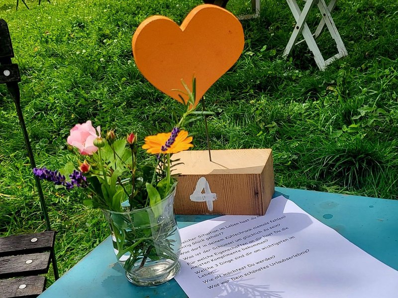 In einem malerischen Setting hatte das Hofteam auf einer Wiese unter alten Obstbäumen 11 Tische liebevoll gedeckt, an denen sich 20 angemeldete und drei spontane Teilnehmerinnen und Teilnehmer nach einem Begrüßungssekt wechselweise 7 Minuten kennenlernen durften. Die Kontaktaufnahme konnte aufgrund vorbereiteter Fragen, z. B. "Was ist der beste Weg, um herauszufinden, wer jemand ist? Worauf freust Du Dich? Was ist die letzte neue Sache, die Du ausprobiert hast?" oder spontan erfolgen. Das Speeddating endete nach zwei anregenden Stunden bei Abschlussfotos und Schnappschüssen mit der Sofortbildkamera und zwei Teilnehmerinnen, bei denen direkt schon mal klar war, dass sie sich gefunden und den Kontakt halten wollen.