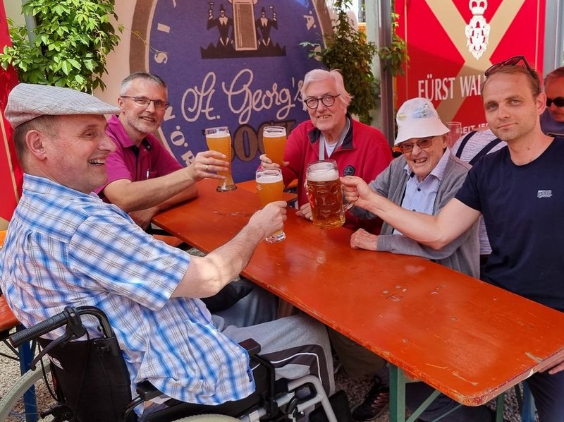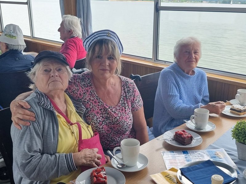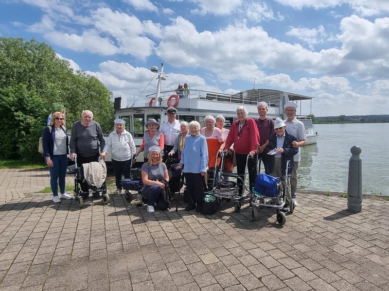 Mehrere Bewohnerinnen und Bewohner ließen sich die Chance eines Schiffsausflugs nicht entgehen. Mit ausgeliehenem Gemeindebus ging es zum ca. 40 km entfernten Stausee bei Gunzenhausen: dem seit 1985 existierenden Altmühlsee. So mancher Teilnehmende erinnert sich noch an die Wiesenlandschaft, die zuvor das Bild des fränkischen Altmühltals prägte. Mit der „MS Altmühlsee“ fuhren wir über das herrlich glitzernde Seewasser, welches urlaubsschön die Sonnenstrahlen reflektierte. Nach dem Dauerregen vergangener Tage war das schöne Wetter auf unserer Seite. Eine Bewohnerin sprach vom Handy euphorisch auf den Anrufbeantworter ihrer Tochter: „Du wirst nicht glauben, dass ich so eben mitten auf dem Altmühlsee Kaffee trinke“ und ein Bewohner, der früher oft seine Wanderrunden um das idyllische Gewässer drehte, schwärmte: „Das ist heute ein richtig schöner Tag, ja das gefällt mir sehr“. Dem wäre nichts mehr hinzuzufügen.