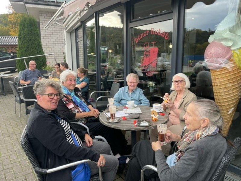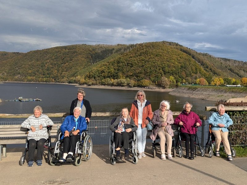 Alltagsbegleiterin Ursula Weyer-Dorscheid, zwei ehrenamtliche Helfer/-innen und eine Gruppe Bewohnerinnen entdeckten auf ihrer Tour mit dem Bulli kleine Eifeldörfer, schwelgten in Erinnerungen und bestaunten Häuser durch hohe Hecken, die so vor dem rauen Eifelwind geschützt sind. Ihr Ziel: Der Rursee. Fast alle teilnehmenden Seniorinnen des Hauses St. Raphael hatten früher hier in der Gegend mit ihren Angehörigen Erholung gesucht und so freuten sie sich sehr über den abwechslungsreichen Ausflug, die Herbststimmung ? und den Sonnenschein ?.