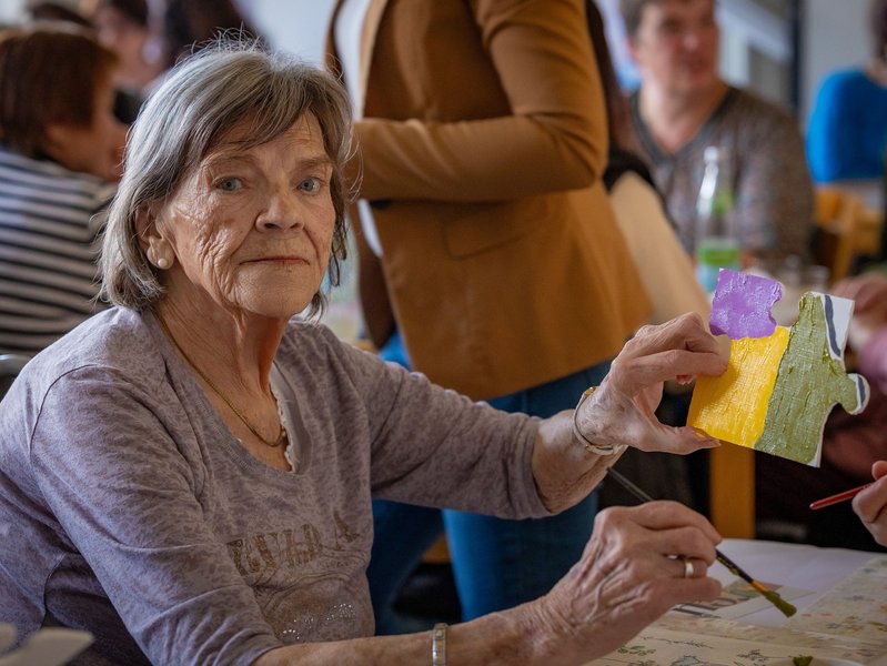 Des Weiteren haben wir alle gemeinsam ein spannendes Kunstwerk geschaffen. Alle Gäste der Veranstaltung hatten die Möglichkeit, große Puzzleteile individuell zu bemalen. Nur die schon vorhandenen schwarzen Linien sollten sichtbar bleiben. Zusammengesetzt ergibt das Puzzlebild eine Aufsicht auf unser Quartier Fremdingen sowie den Fremdingen-Schriftzug. Die schwarzen Linien sind die Straßen und Flüsse, Schienen, Häuser… Das farbenfrohe Werk hängt inzwischen im Eingangsbereich von Schloss Hochaltingen und freut sich über zahlreiche Besucherinnen und Besucher!