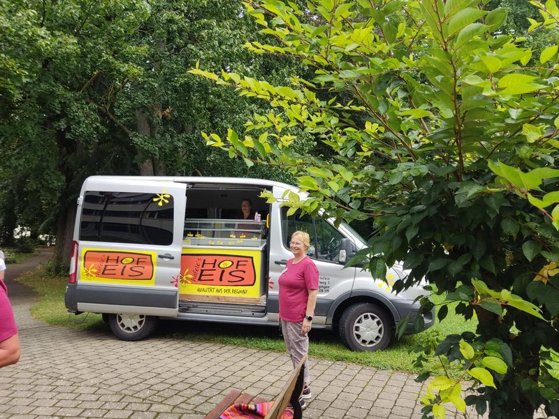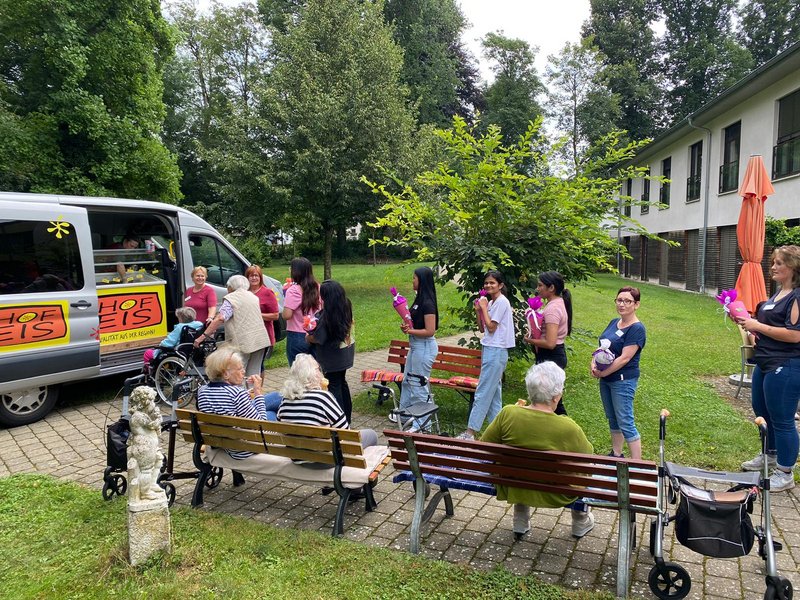Dieses Jahr konnten wir einen Rekord feiern, sage und schreibe zehn junge Menschen begannen heute bei uns. Am 1. Tag begann alles noch recht entspannt mit einem Einführungstag, danach lernen die angehenden Fachkräfte dann die verschiedenen Bereiche unseres Hauses und den ambulanten Dienst kennen. Zufälligerweise hatten wir, um die sommerlichen Temperaturen der letzten Tage etwas angenehmer zu machen, den Eiswagen mit leckerem Hofeis in unserem Park. Überredungskunst brauchten wir da nicht, und schnell bildete sich eine lange Schlange am Eiswagen, in die sich neben den Bewohnerinnen, Bewohnern und Mitarbeitenden auch unsere neuen Auszubildenden einreihten.
