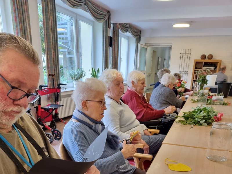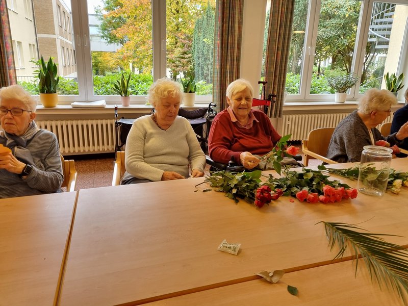 Am Montag der dritten Oktoberwoche trafen sich viele Bewohnerinnen und Bewohner zum Herstellen von Dekoration für das Haus sowie Geschenken für die immobilen Bewohnerinnen sowie Bewohner. Man traf sich im Fernsehsaal, um dort z.B. beim Binden von Blumensträußen gemeinsam aktiv zu werden. Alle erfreuten sich über die neu hergestellte Dekoration und das Verschönern des St. Josefshauses.
