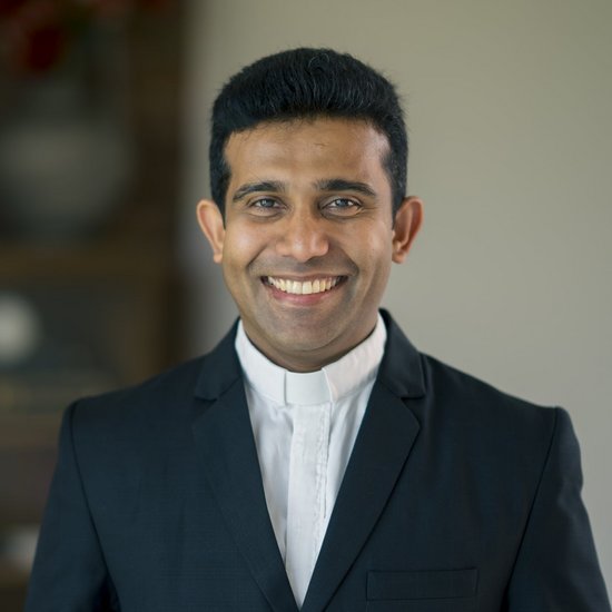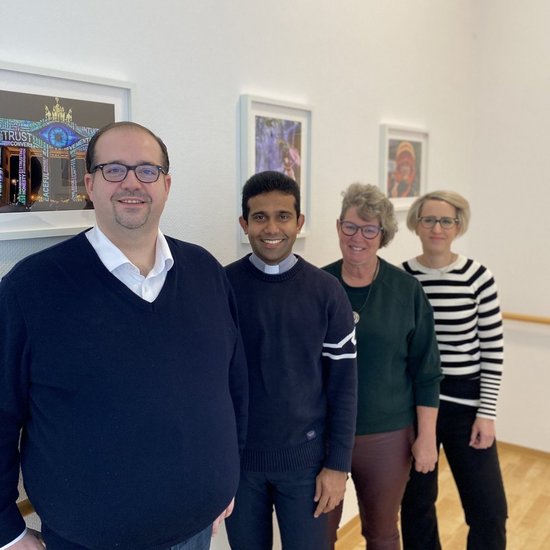 von links nach rechts: Dennis Eßer, Pater Maneesh, Ursula Weyer-Dorscheid, Celine Kölschbach